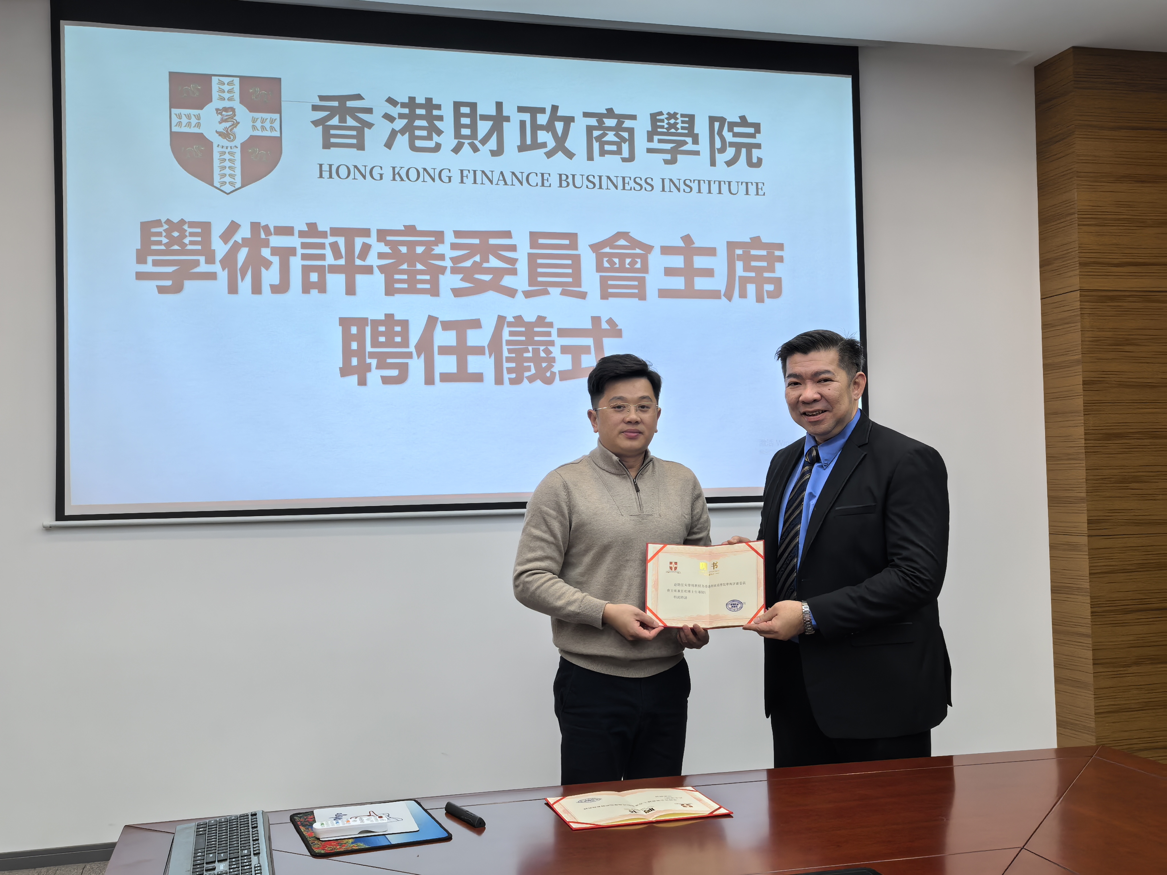 随后,学院董事会主席陈中超博士正式向朱伟明教授颁发了聘书,此次受聘标志着朱教授正式成为香港财政商学院的一员,将在未来的研究生教育中发挥重要作用。学院领导表示,朱伟明教授的加入,将进一步提升学院的师资力量和学术水平,为培养更多具有国际视野和创新能力的高素质工商管理人才提供有力保障。