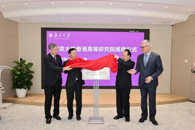 谭铁牛、郑松岩、香港大学校长张翔、香港理工大学校长滕锦光共同为“南京大学香港高等研究院”揭牌。